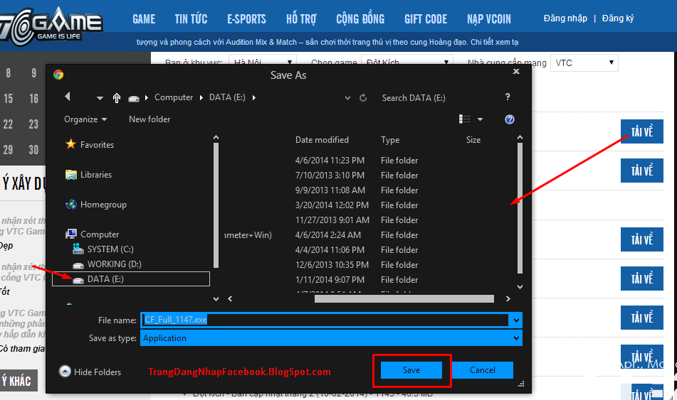 Sau khi nhấn vào nút tải về một cửa sổ sẽ hiện ra yêu cầu bạn chọn vị trí để lưu game đột kích, bạn chọn ổ đĩa nào còn trống nhiều và nhấn "SAVE".Sau khi nhấn "SAVE" chương trình sẽ tự động tải về cho bạn, khi tải xong bạn hãy tìm hiểu bài "Hướng dẫn cài đặt game CF, game đột kích offline trên máy tính" để bắt đầu cài đặt game cho mình.