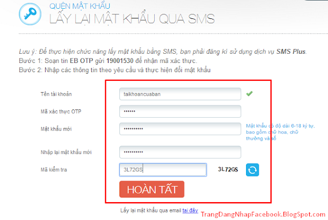Bước 3.3: Sau khi nhận được tin nhắn OTP bạn điền đầy đủ thông tin và mật khẩu mới vào form như hình dưới đây: