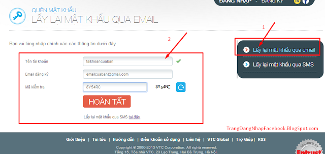 - Nhấn vào link lấy mật khẩu qua Email theo hình dưới đây để sang trang lấy lại mật khẩu theo Email.- Một form để bạn nhập thông tin gồm: Tài khoản đột kích và email mà bạn đã đăng ký , tiếp đó là nhập mã xác nhận bao gồm các ký tự bên phải, rồi nhấn "Hoàn Tất" để hoàn tất lấy lại mật khẩu, lúc này mật khẩu sẽ được gửi vào Email của bạn.