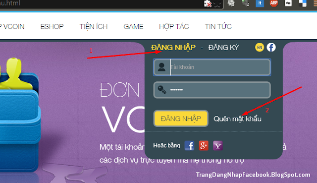 - Bạn click vào nút đăng nhập để form đăng nhập hiện ra.- Sau đó nhấn vào link: "Quên mật khẩu" như hình dưới đây: